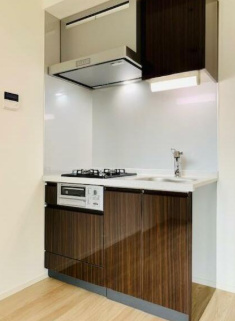 2口ガスコンロのシンプルなシステムキッチンです。シンク・コンロ・調理台・収納が一体化されており、見た目もすっきりしていて、掃除のしやすさにも優れています。吊戸棚、シンク下の棚など、調理家電などを収納するのに便利です。グリル付きでお料理の幅も広がります。