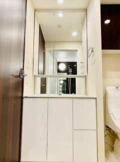 鏡を見ながら朝の身支度やスキンケアなどが快適におこなえます。鏡の裏、洗面台下は収納スペースになっており備品や清掃道具などの収納に便利です。