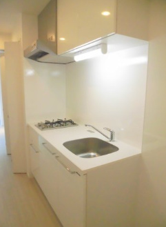 2口ガスコンロのシンプルなシステムキッチンです。シンク・コンロ・調理台・収納が一体化されており、見た目もすっきりしていて、掃除のしやすさにも優れています。吊戸棚、シンク下の棚など、調理家電などを収納するのに便利です。