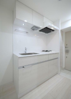 2口ガスコンロのシンプルなシステムキッチンです。シンク・コンロ・調理台・収納が一体化されており、見た目もすっきりしていて、掃除のしやすさにも優れています。吊戸棚、シンク下の棚など、調理家電などを収納するのに便利です。