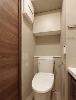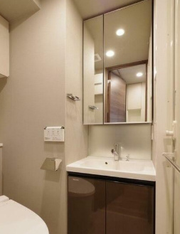 大きな鏡のある洗面台で身支度やスキンケアなどが快適におこなえます。鏡の裏、洗面台下は収納スペースになっており備品や清掃道具などの収納に便利です。