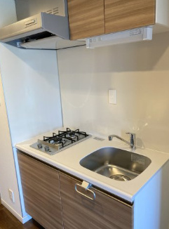 コンロ・シンク・調理台・収納が一体化されたキッチン設備で、見た目の美しさと機能性を兼ね備えています。スペースを有効活用できるよう設計されており、調理器具や食器類をすっきりと収納できるため、生活感を抑えた清潔な空間を保ちやすくなります。