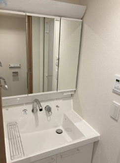 3面鏡の洗面台で身支度やスキンケアなどが快適におこなえます。鏡の裏、洗面台下は収納スペースになっており備品や清掃道具などの収納に便利です。