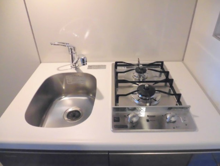 2口ガスコンロのシステムキッチンです。シンク・コンロ・調理台・収納が一体化されており、見た目もすっきりしていて、掃除のしやすさにも優れています。コンパクトながら調理スペースも確保されています。