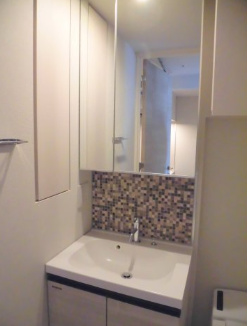 大きな鏡のある独立洗面台です。鏡の裏、洗面台の下に収納スペースがあるので、洗面小物や掃除道具などスッキリと収納できます。