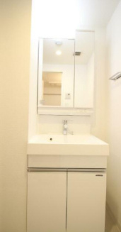 大きな鏡のある独立洗面台です。鏡の裏、洗面台の下に収納スペースがあるので、洗面小物や掃除道具などスッキリと収納できます。