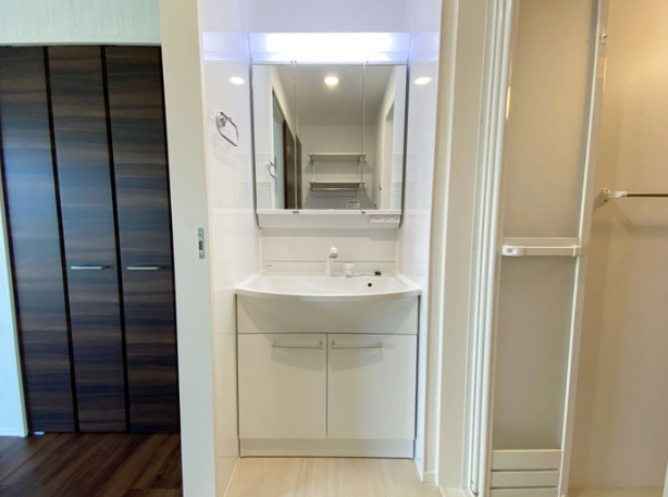 洗顔・歯磨き・メイク・ヘアセットなど、日常の身支度を落ち着いて行える環境が整っています。洗面台の周辺には収納スペースが設けられていることが多く、歯ブラシや化粧品、タオルなどをすっきりと整理できるため、生活感を抑えた清潔な印象のインテリアにもつながります。