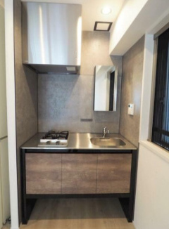 2口コンロのシンプルなシステムキッチンです。シンク・コンロ・調理台・収納が一体化されており、見た目もすっきりしていて、掃除のしやすさにも優れています。まな板が置ける調理スペースあり便利です。