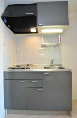 2口コンロのシンプルなシステムキッチンです。シンク・コンロ・調理台・収納が一体化されており、見た目もすっきりしていて、掃除のしやすさにも優れています。まな板が置ける調理スペースあり便利です。