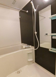 ツートンカラーのスタイリッシュな浴室です。トイレと浴室が別々の空間に分かれているため、湿気や臭いの問題も軽減されます。また、シャワーだけでなく湯船に浸かることもでき、リラックスした時間を過ごせるのも魅力です。