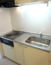 2口コンロのシンプルなシステムキッチンです。シンク・コンロ・調理台・収納が一体化されており、見た目もすっきりしていて、掃除のしやすさにも優れています。まな板が置ける調理スペースあり便利です。