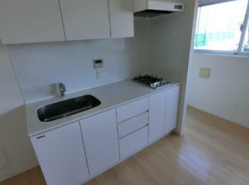 二口コンロのキッチンです。グリル付きでお料理の幅が広がります。シンク下には大容量の収納スペースがあり、調理器具がすっきりと収納できます。広い調理スペースがありお料理が捗ります。