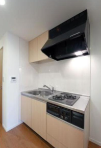 2口コンロのシンプルなシステムキッチンです。シンク・コンロ・調理台・収納が一体化されており、見た目もすっきりしていて、掃除のしやすさにも優れています。グリル付きでお料理の幅が広がります。