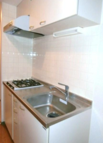 2口コンロのシンプルなシステムキッチンです。シンク・コンロ・調理台・収納が一体化されており、見た目もすっきりしていて、掃除のしやすさにも優れています。