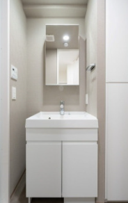 独立洗面台があると朝の身支度がスムーズにおこなえます。鏡の裏側や洗面台の下のスペースに洗面用具や備品などをすっきりと収納できます。