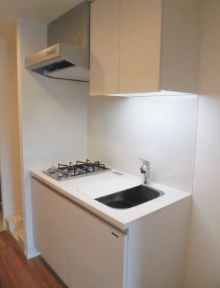 2口ガスコンロのシステムキッチンです。シンク・コンロ・調理台・収納が一体化されており、見た目もすっきりしていて、掃除のしやすさにも優れています。コンパクトながら調理スペースも確保されています。