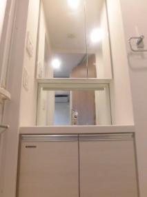 大きな鏡のある独立洗面台です。鏡の裏、洗面台の下に収納スペースがあるので、洗面小物や掃除道具などスッキリと収納できます。