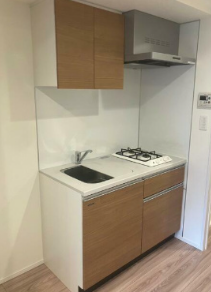 2口ガスコンロのシステムキッチンです。シンク・コンロ・調理台・収納が一体化されており、見た目もすっきりしていて、掃除のしやすさにも優れています。