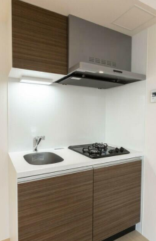 2口ガスコンロのシステムキッチンです。シンク・コンロ・調理台・収納が一体化されており、見た目もすっきりしていて、掃除のしやすさにも優れています。コンパクトながら調理スペースも確保されています。