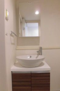 大きな鏡のある独立洗面台です。鏡の裏、洗面台の下に収納スペースがあるので、洗面小物や掃除道具などスッキリと収納できます。