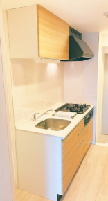 2口ガスコンロのシステムキッチンです。シンク・コンロ・調理台・収納が一体化されており、見た目もすっきりしていて、掃除のしやすさにも優れています。コンパクトながら調理スペースも確保されています。
