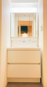 三面鏡の独立洗面台は、毎日の身支度を快適にしてくれる人気の設備です。鏡が左右に開くことで角度を変えて顔まわりを確認でき、ヘアセットやメイクがしやすい点が大きな魅力です。鏡の裏には収納スペースが備わっているため、化粧品やスキンケア用品、歯ブラシなどの細かなアイテムをすっきりしまうことができ、洗面台まわりが散らかりにくくなります。独立した洗面スペースがあることで、朝の準備や帰宅後の手洗いがスムーズになり、生活動線も整います。