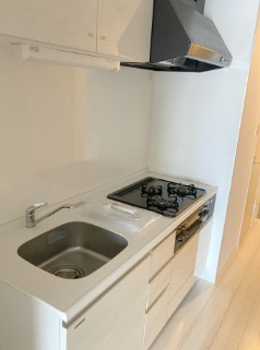 2口ガスコンロのシステムキッチンです。シンク・コンロ・調理台・収納が一体化されており、見た目もすっきりしていて、掃除のしやすさにも優れています。コンパクトながら調理スペースも確保されています。