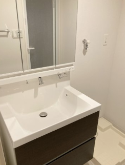 三面鏡の独立洗面台は、毎日の身支度を快適にしてくれる人気の設備です。鏡が左右に開くことで角度を変えて顔まわりを確認でき、ヘアセットやメイクがしやすい点が大きな魅力です。鏡の裏には収納スペースが備わっているため、化粧品やスキンケア用品、歯ブラシなどの細かなアイテムをすっきりしまうことができ、洗面台まわりが散らかりにくくなります。独立した洗面スペースがあることで、朝の準備や帰宅後の手洗いがスムーズになり、生活動線も整います。