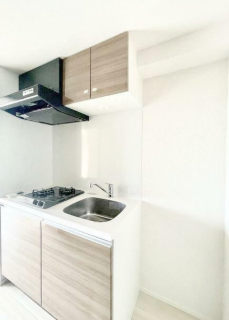 2口ガスコンロのシステムキッチンです。シンク・コンロ・調理台・収納が一体化されており、見た目もすっきりしていて、掃除のしやすさにも優れています。コンパクトながら調理スペースも確保されています。