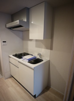 2口ガスコンロのシステムキッチンです。シンク・コンロ・調理台・収納が一体化されており、見た目もすっきりしていて、掃除のしやすさにも優れています。コンパクトながら調理スペースも確保されています。キッチンが独立していることで、料理のにおいが生活スペースに広がりにくく、部屋全体をすっきり保ちやすくなります。