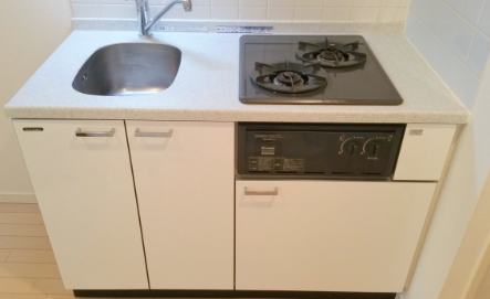 2口ガスコンロのシステムキッチンです。シンク・コンロ・調理台・収納が一体化されており、見た目もすっきりしていて、掃除のしやすさにも優れています。コンパクトながら調理スペースも確保されています。