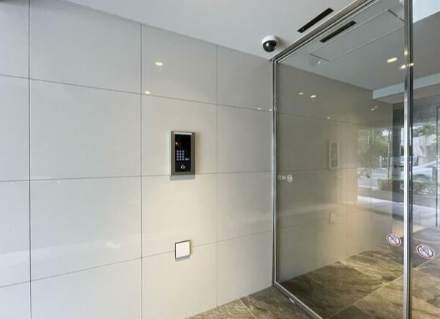 オートロック付きのエントランスです。住人以外の人物が建物内に容易に立ち入れないようにすることで、防犯性と安心感を高める役割を果たします。