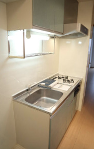 2口ガスコンロのシステムキッチンです。シンク・コンロ・調理台・収納が一体化されており、見た目もすっきりしていて、掃除のしやすさにも優れています。コンパクトながら調理スペースも確保されています。キッチンが独立していることで、料理のにおいが生活スペースに広がりにくく、部屋全体をすっきり保ちやすくなります。