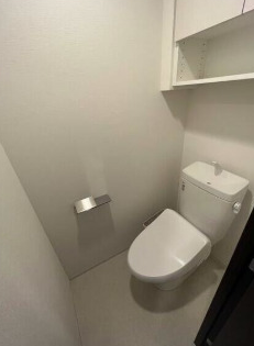 個室トイレで静かな環境です。温水洗浄便座の機能がついているため、いつでも快適に清潔に保つことができます。吊戸棚が設置されていて備品などの収納に便利です。