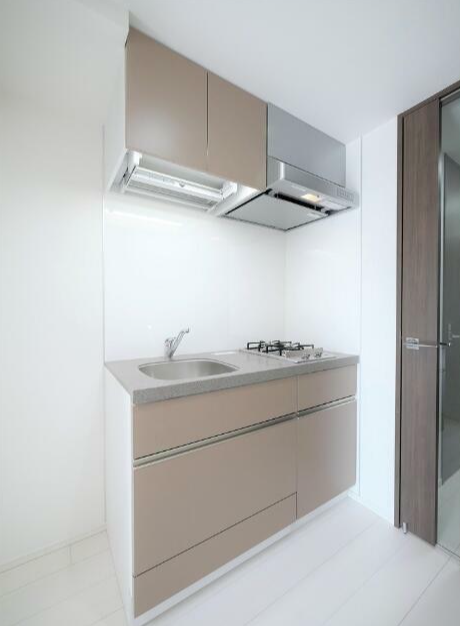 2口ガスコンロのシステムキッチンです。シンク・コンロ・調理台・収納が一体化されており、見た目もすっきりしていて、掃除のしやすさにも優れています。